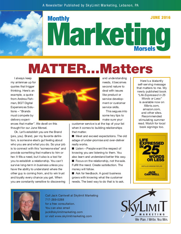 I always keep my antennae up for quotes that trigger thinking. Here’s an example, a quote from Andrea Fishman, BGT Digital Experiences Solutions – “Brands must compete by delivery experiences that matter”. We dwell on this thought for our June Morsel.