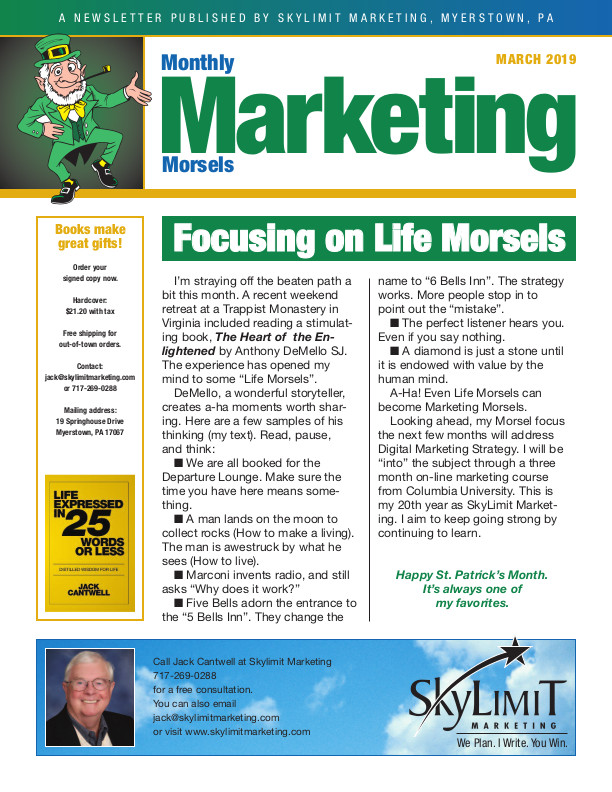 I’m straying off the beaten path a bit this month. A recent weekend retreat at a Trappist Monastery in Virginia included reading a stimulating book, The Heart of the Enlightened by Anthony DeMello SJ. The experience has opened my mind to some “Life Morsels”.