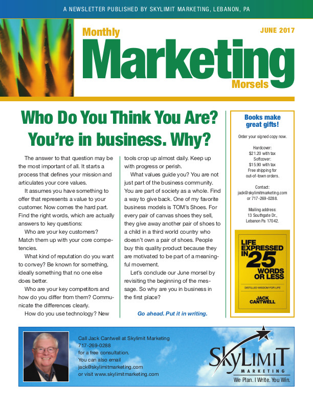 The answer to that question may be the most important of all. It starts a process that defines your mission and articulates your core values.